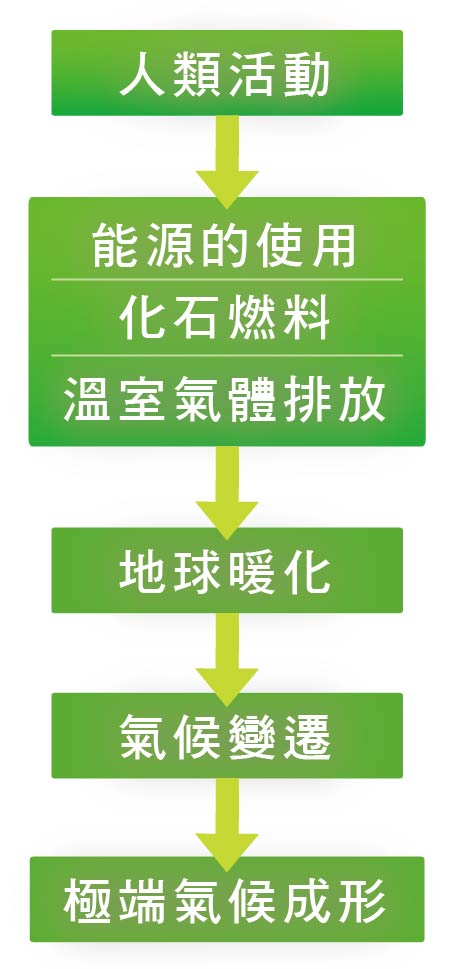 人類的活動造就全球氣溫上升,歸因於二氧化碳等主要因燃燒碳及石油等礦石燃料所產生的溫室氣體。