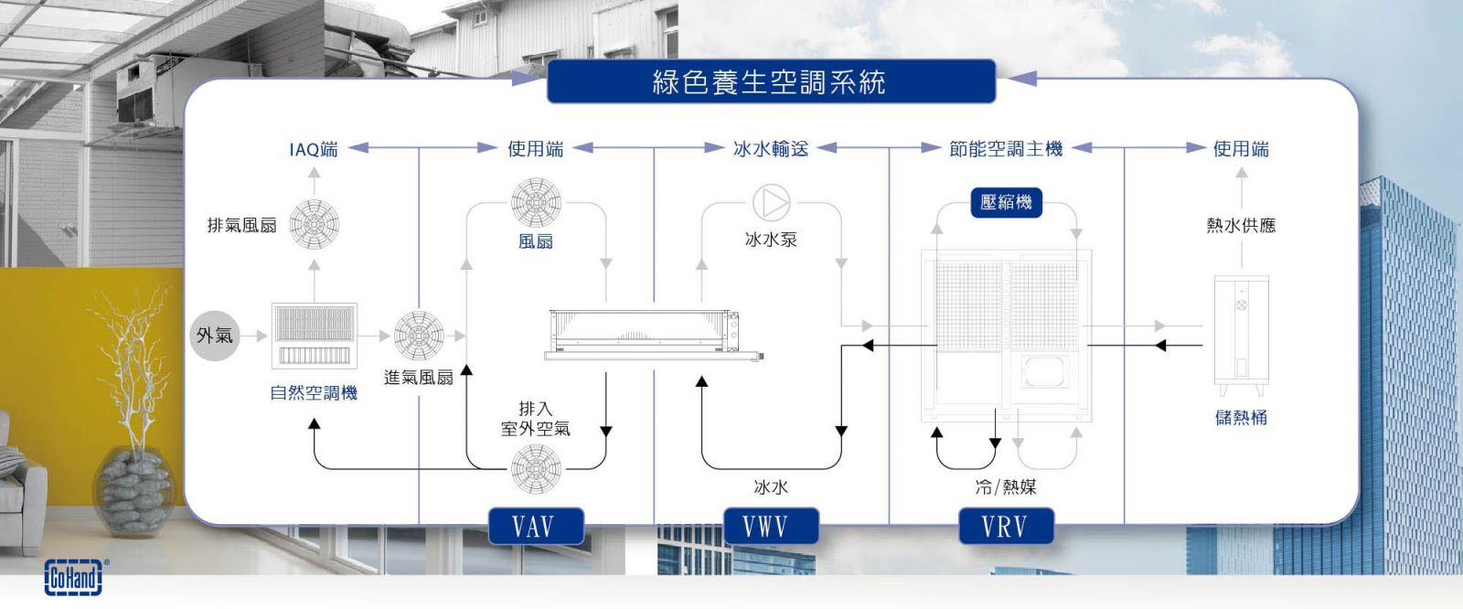 VAV (變風量 Variable Air Volume):依空調負荷改變風量,配合風機的運轉特性。